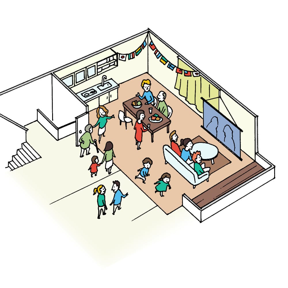 26첩의 넓은 커뮤니티 스페이스는, 프로젝터나 탁구대를 비롯해 입주자 전원이 느긋하게 편히, 교류를 즐길 수 있는 공간. 정기적으로 아파트 입주자와의 교류회도 개최됩니다.