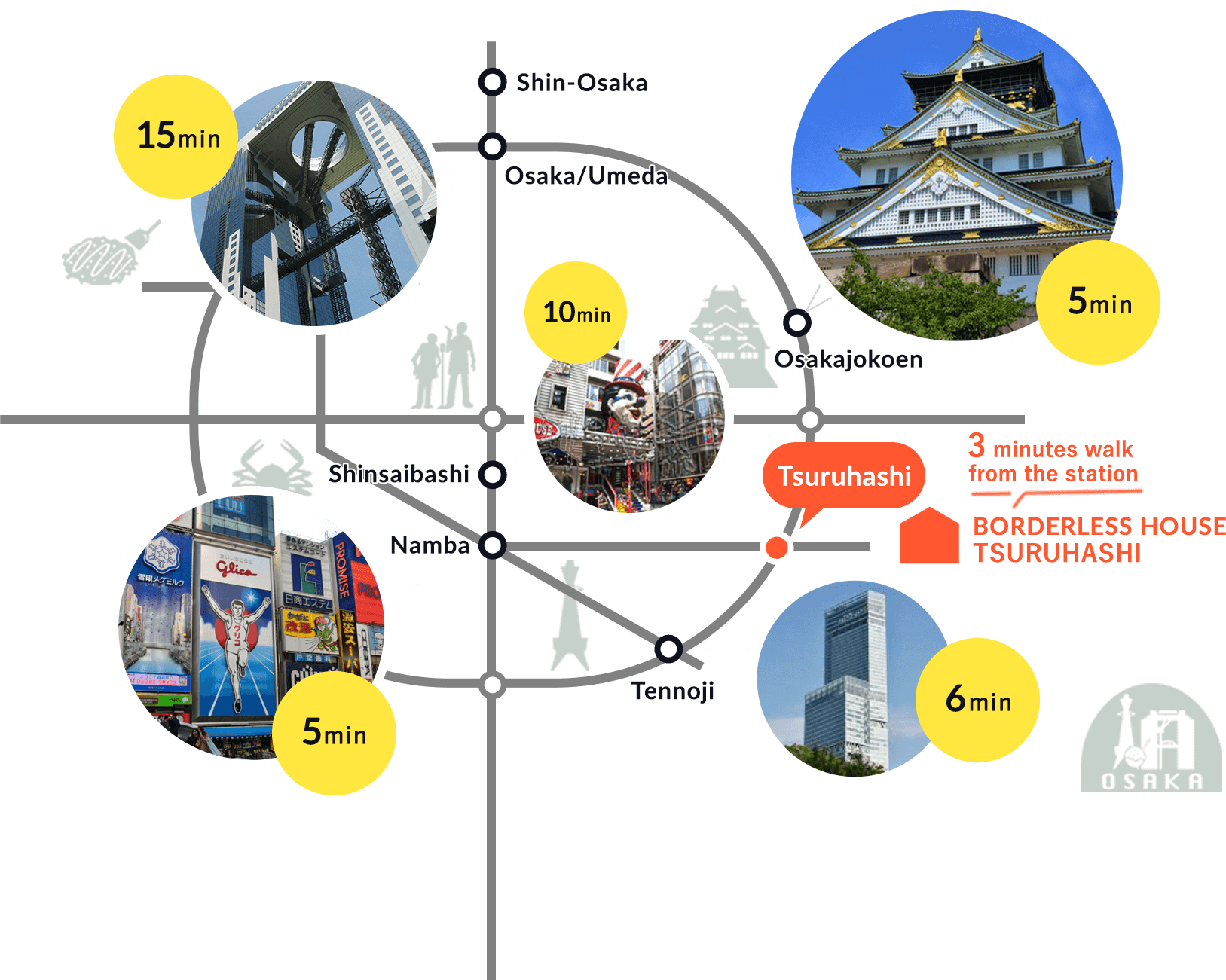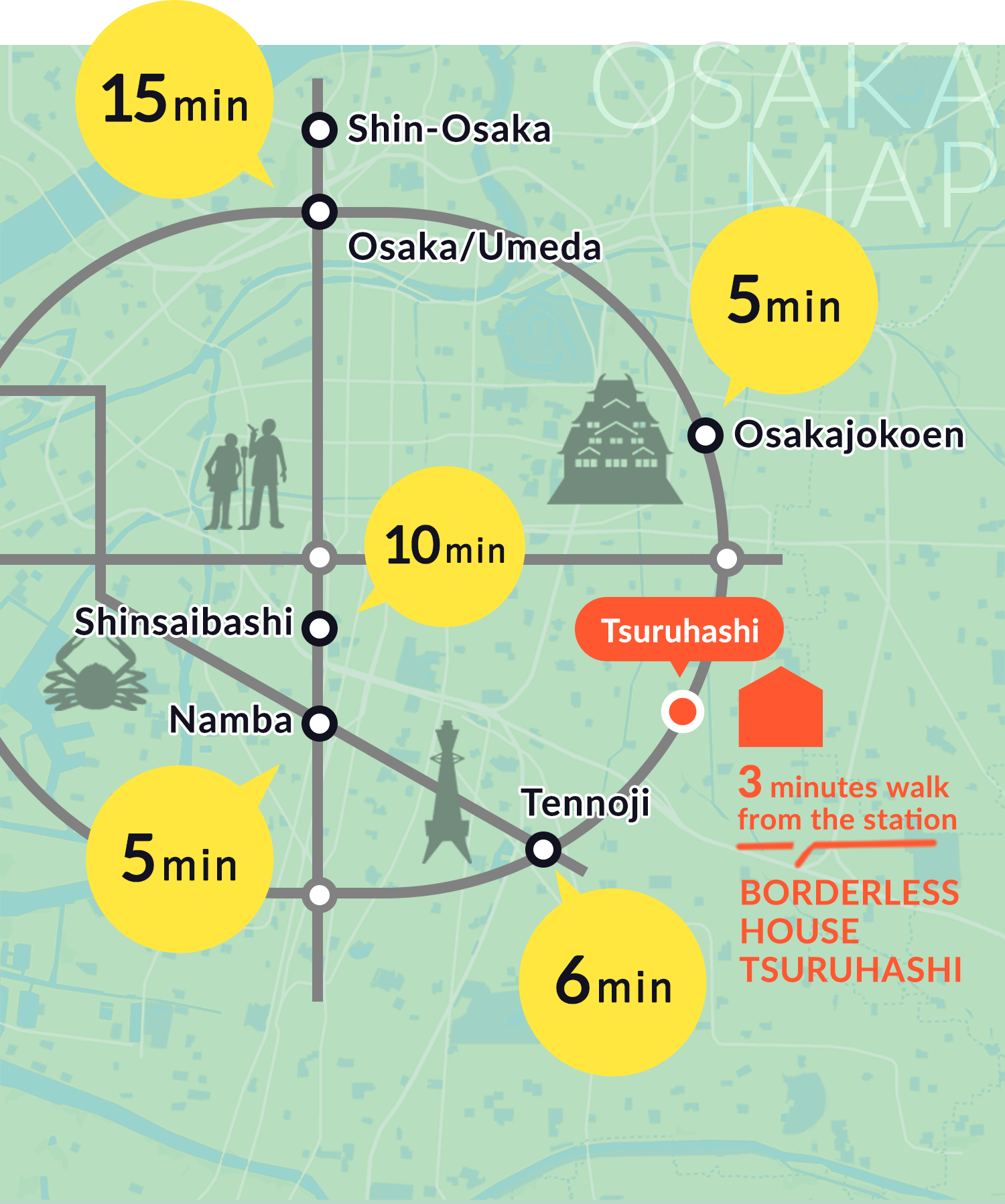 보더리스 쉐어하우스 츠루하시 1 하우스는 JR,지하철,킨테츠까지 총 3가지 노선을 이용할수 있는 츠루하시역에서 도보 3분거리에 있습니다.