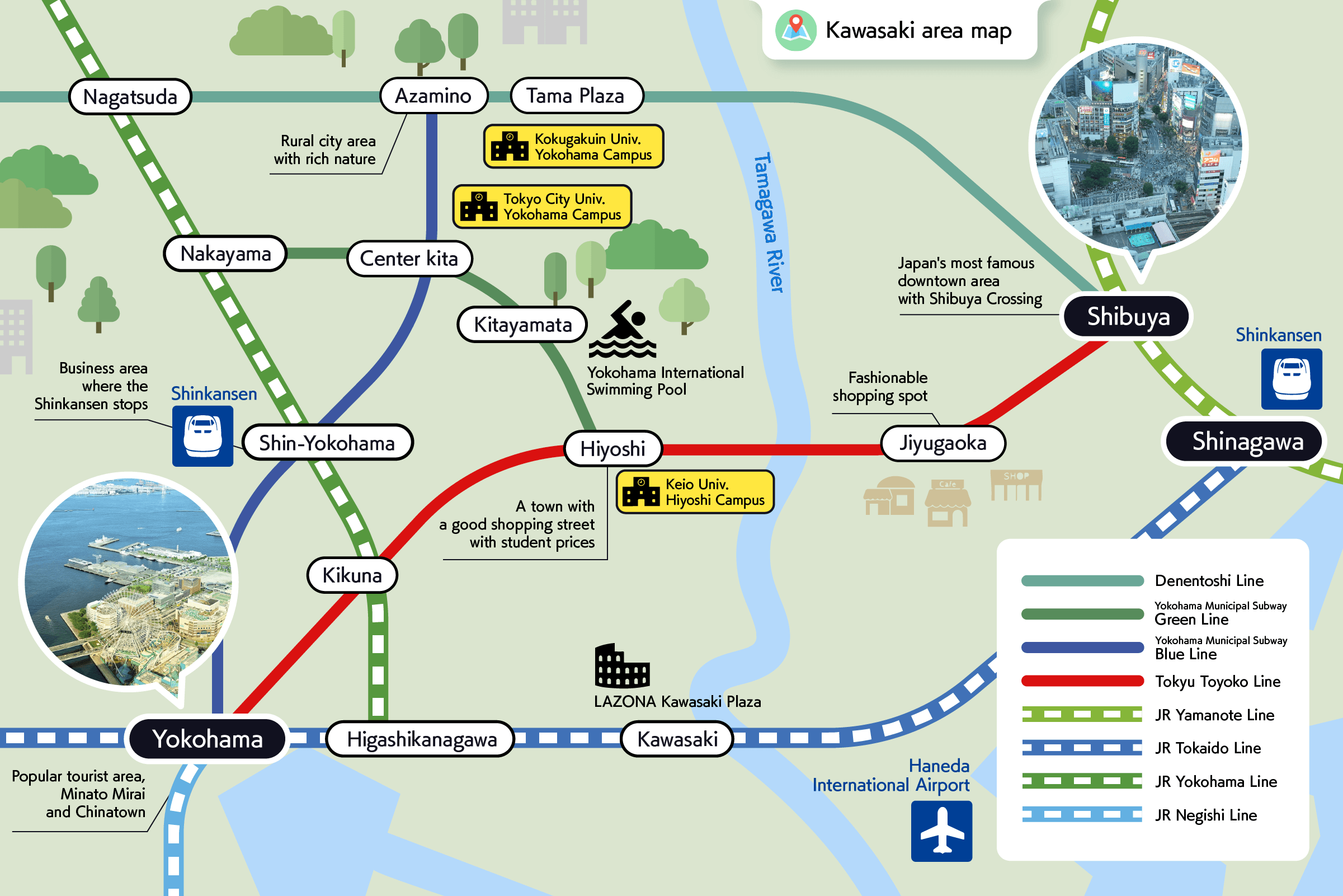It is good to access to everywhere in Tokyo and Yokohama and a very convenient location to go to school and commuting. You can buy what you need on a daily basis around the station. Also, Yokohama is not only livable but also has a deep culture and history.